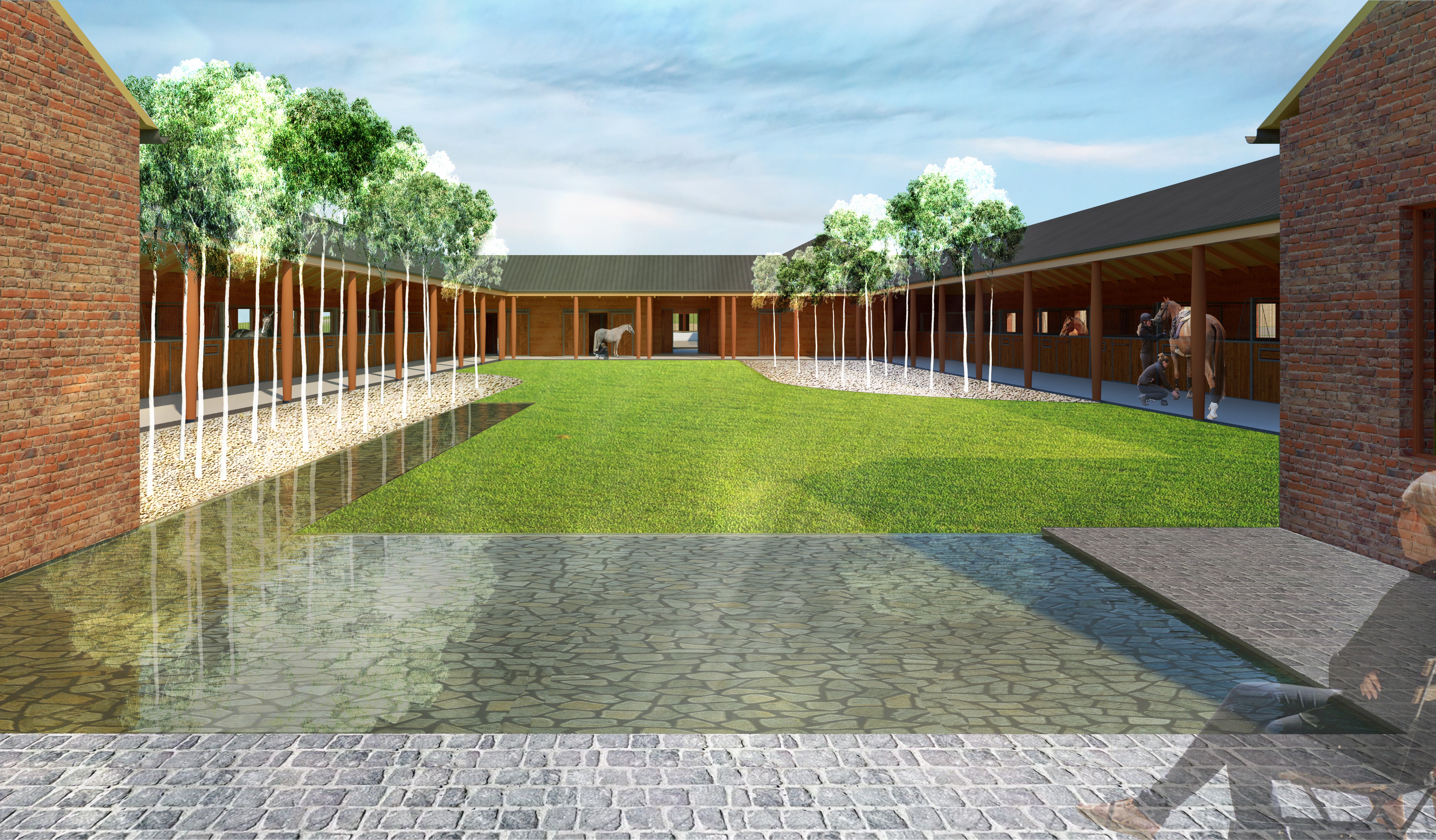 A traditional weatherboard clad barn building, with height to allow for a multi-purpose loft at one end. The generous height, large sliding door openings as well as the ridge vent assist in creating a healthy internal environment in a stables building that provides complete shelter from the elements. The stables enclosures feature one swinging divider panel to allow for conversion of two stables to one mare and foal box.